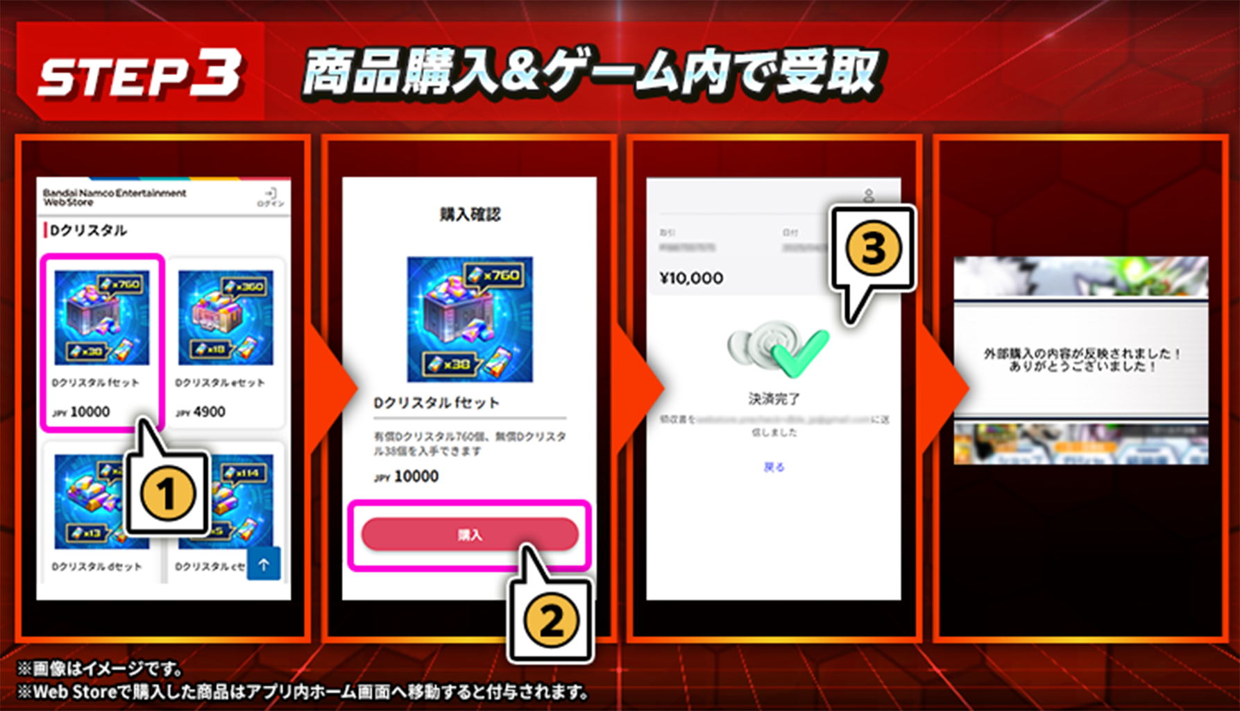 Web Storeの商品を購入・交換後、アプリ内ホーム画面を開くと、自動的に商品を受け取ることができます。